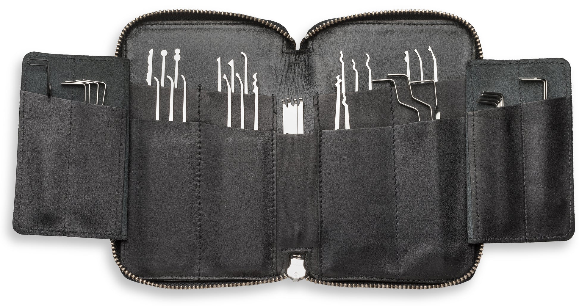 This M4000B High Yield Lock Pick Set includes our complete MAX line, with 18 picks with rivetless stainless steel handles in .020" thickness, two double-ended picks in .023" thickness, and seventeen tension tools, in an oversized zipper case made of the finest Valentino leather. Lifetime Warranty (details here).