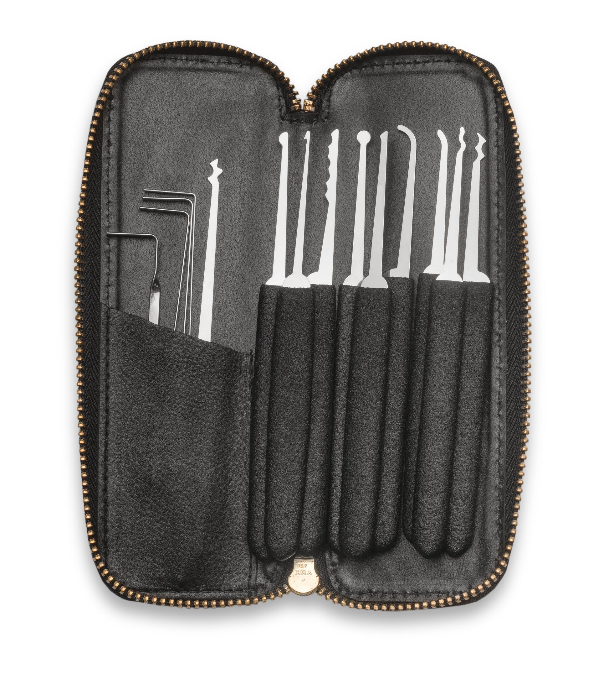 Leather, leather lined, zippered deluxe case for the PXS-14 Lock Pick Set - One pocket Dimensions: 6 inches x 2 1/4 inches. (Lock picks not included).