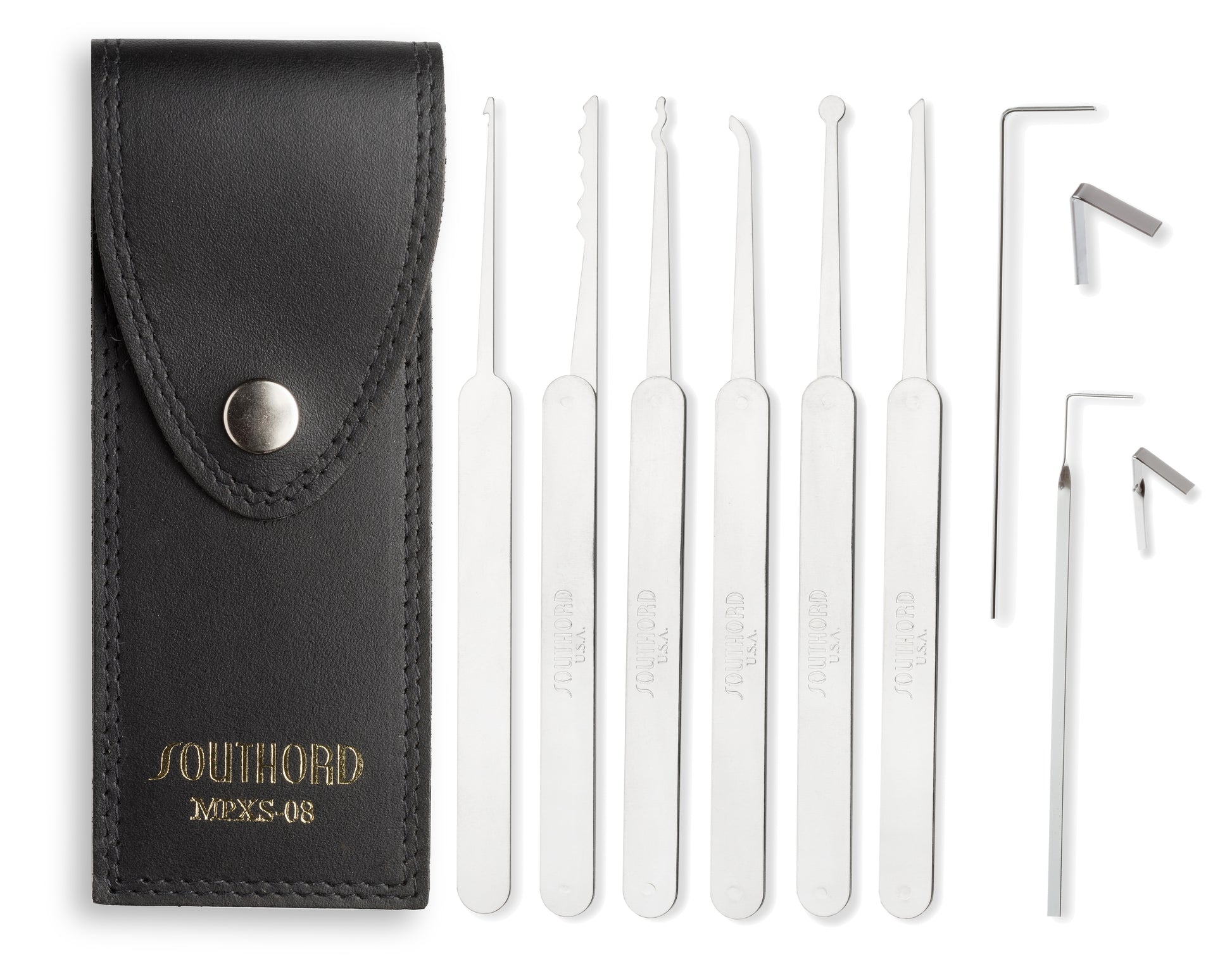 Our MPXS-08 eight-piece lock pick set with metal handles includes five lock picks with rivetless stainless steel handles, a broken key extractor, and two tension tools in a compact snapover leather case.