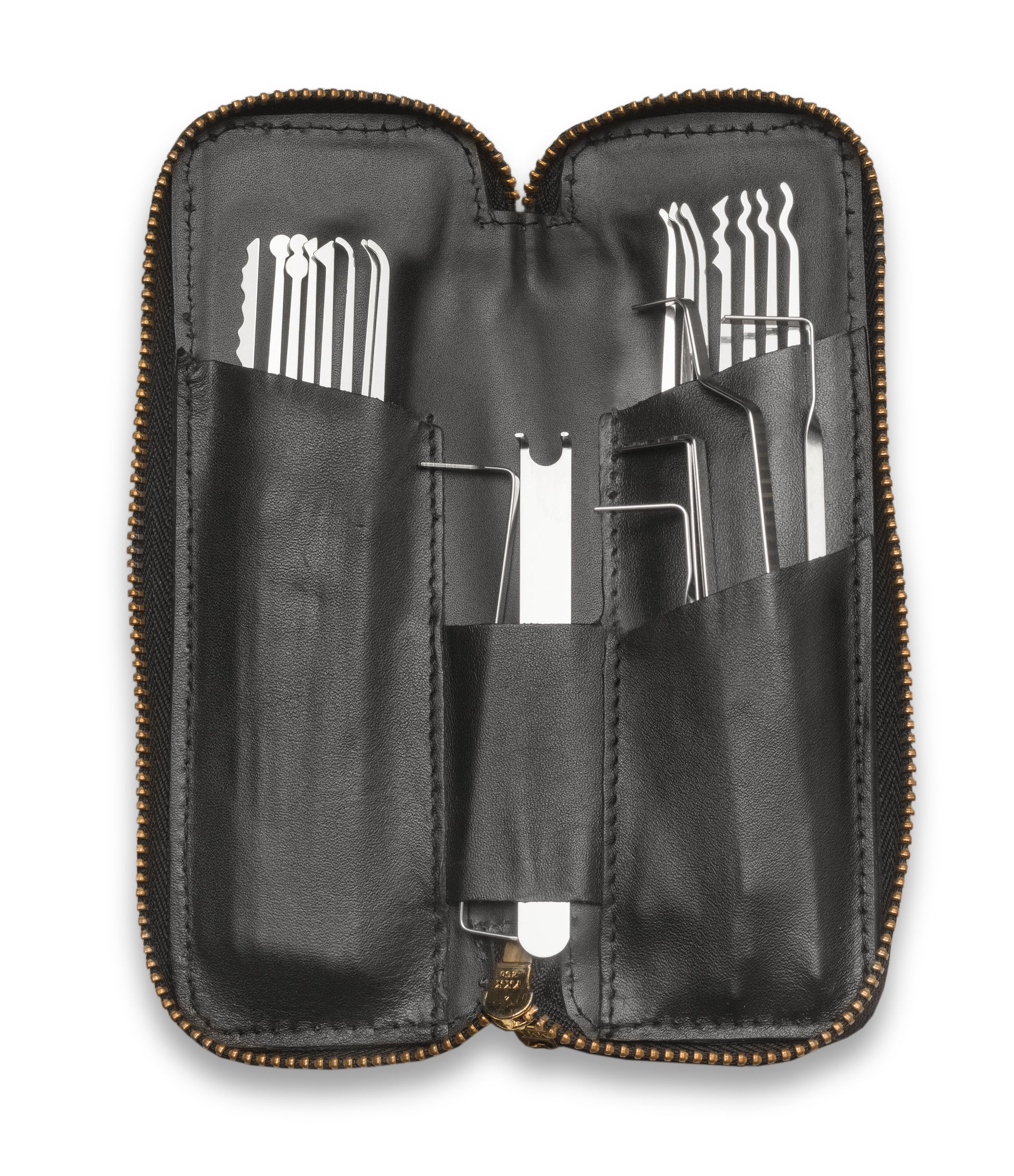 Made for European and Japanese locks, and U.S. locks with small or narrow keyways, this SouthOrd 22- Slim Line Piece Lock Pick Set includes 15 lock picks with metal handles and seven different tension tools. The luggage quality zippered case is the perfect companion to house our high-quality stainless-steel tools and is available in genuine Nappa Leather or Vegan Leather.